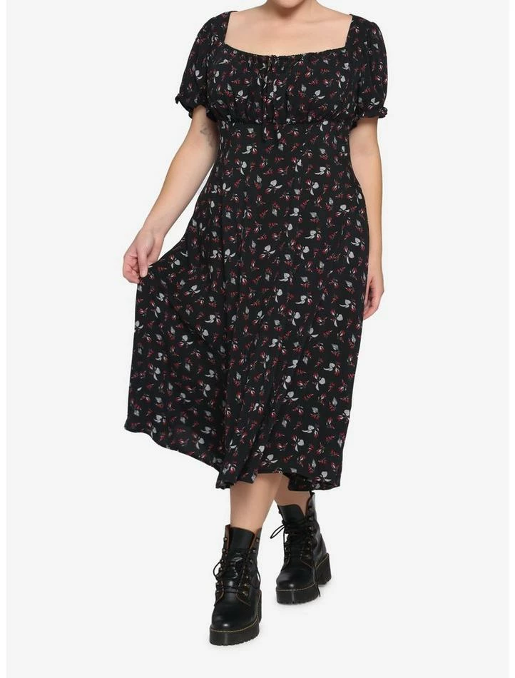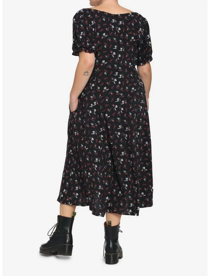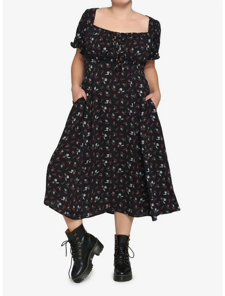 Keep it classic with an Empire waistline. This black soft dress features an allover red rose bud print. There is lace-up detail at the chest, puffed sleeves and side seam hip pockets.