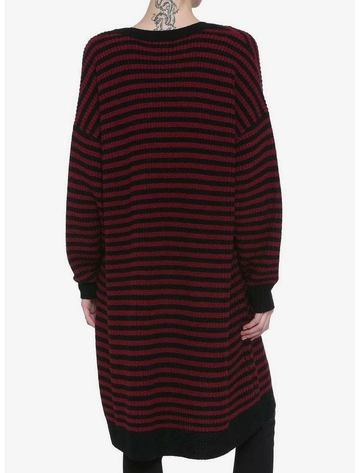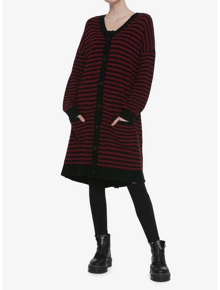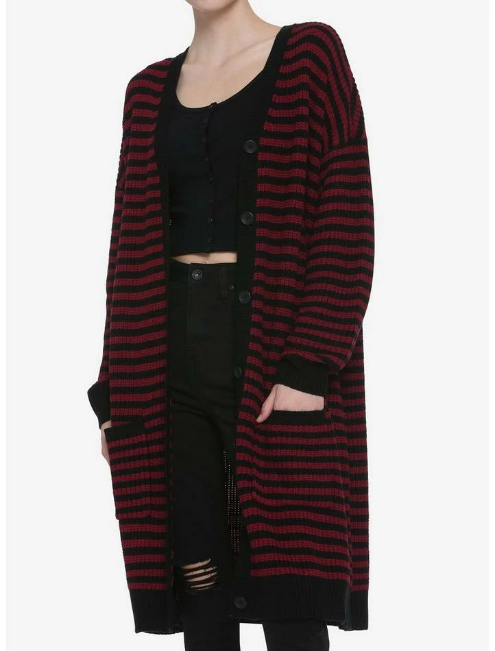 This cardigan combines two of our fashion faves; black and red stripes and long cardigans! Your new BFF features a button front closure and patch pockets.