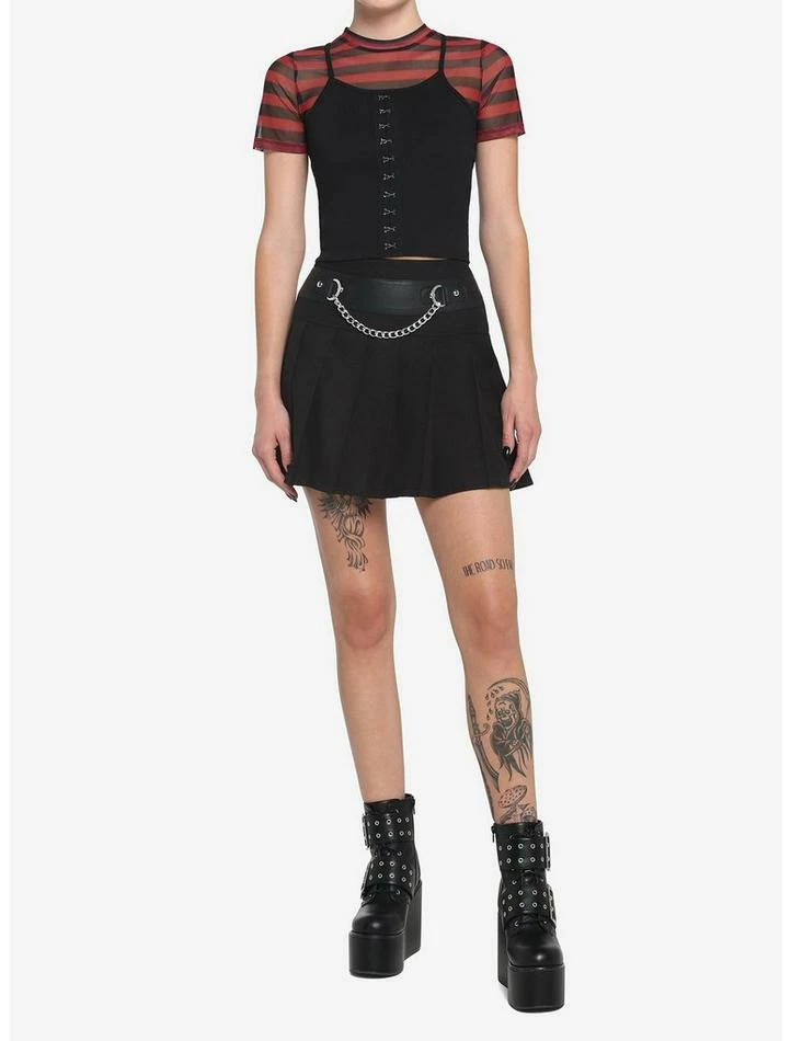Your punk ‘fit wouldn’t be complete without classic stripes! This twofer has a cropped fit and features a mesh black and red striped tee, and a cami with hook-and-eye detailing down the front. Wear them together or on their own to change up your look!