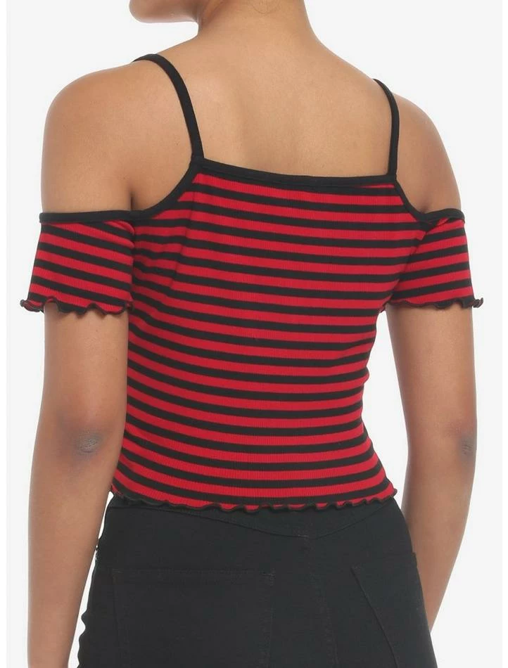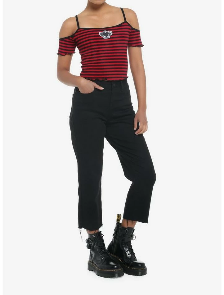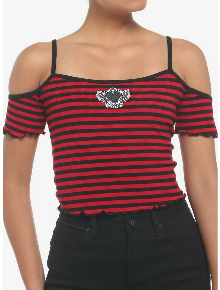 Looking for a little top to go with your oversized pants? This cold shoulder number is ready to light up your next look. It has lettuce hems, a ribbed knit and an ornate embroidered patch with a heart on the chest.