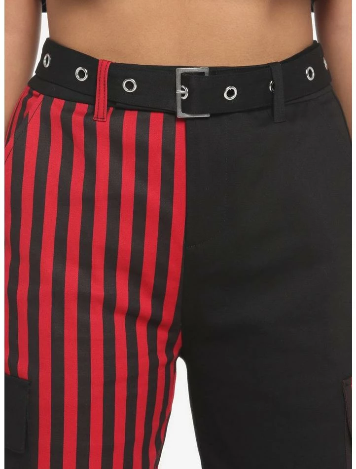 Our two favorite things: Stripes and a good color palette. These cargo joggers are the perfect combination of both! They feature a black and red stripe and solid black split design with contrast cargo pockets. Comes with hip and back pockets, elasticated ankles and a grommet belt.