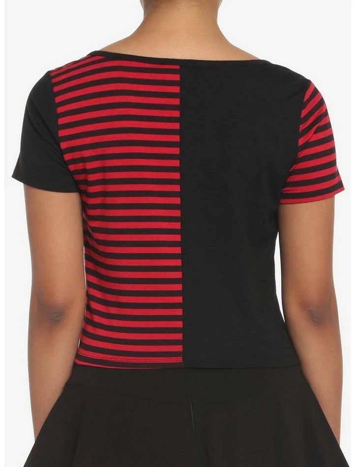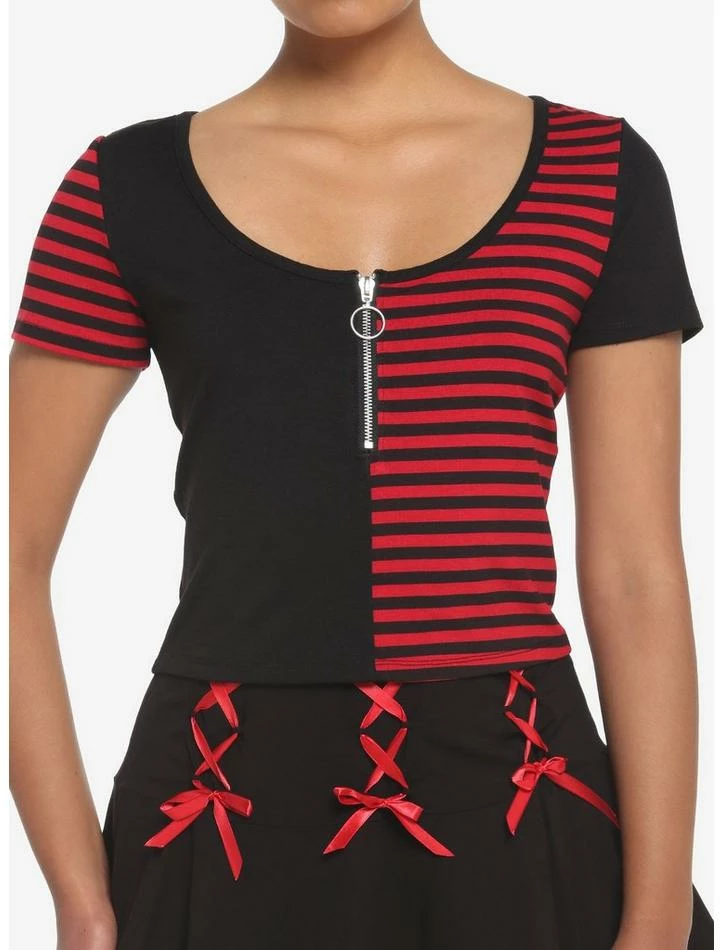 Black and red is the best color combo. This baby-fit tee features a split solid black and red and black stripe design with zipper detailing on the front.