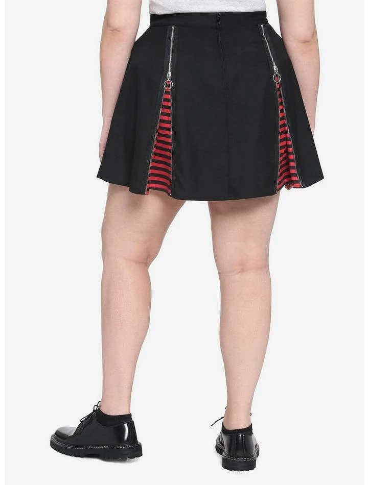 Spice up your skirt game with this edgy piece! This skirt features 2 zippers in the back and front, black and red stripe detailing under zippers, pockets and O-ring silver tone hardware. Back zipper closure.