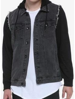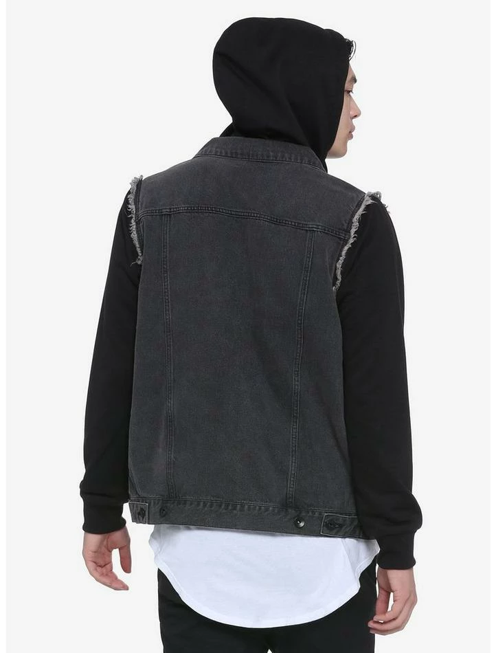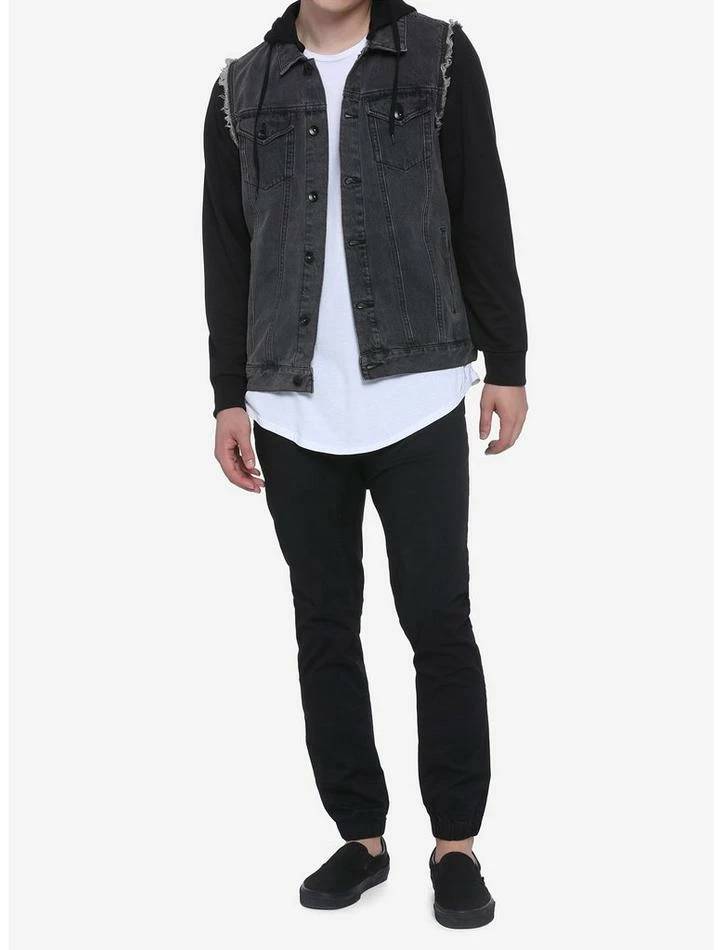 A black jacket that’s perfect all-year long! This black jacket features a washed denim body and hood and sleeves. Bonus: the sleeves and hood are removable! Featuring a button-up closure, 2 chest pockets and 2 side pockets.