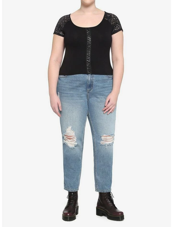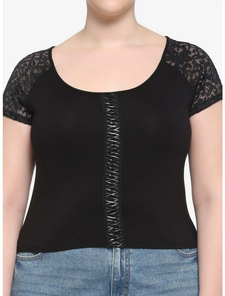 Bring some dark drama to your look in this black cropped top. Featuring rose-patterned lace sleeves and lace-up detailing down the front.