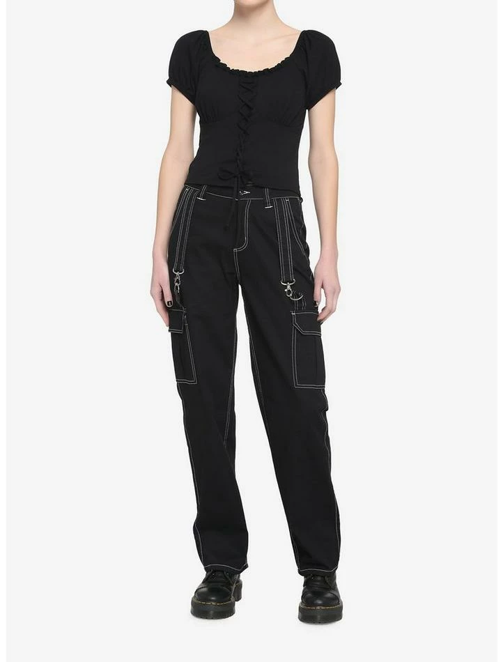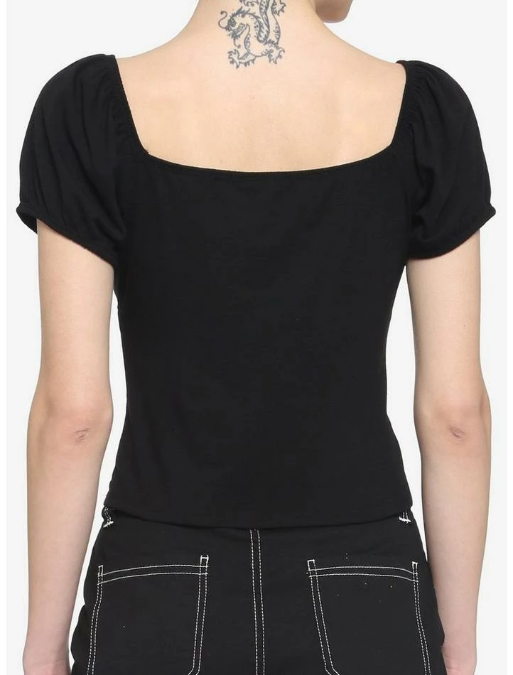 Bring some dark drama to your look in this black cropped top. Featuring rose-patterned lace sleeves and lace-up detailing down the front.