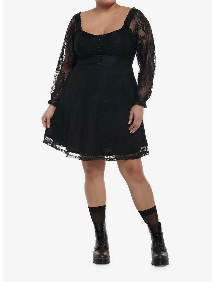 Keep your LBD collection romantic and dreamy with this long-sleeve dress! Featuring a corset-styled bust with hook-and-eye closures down the center and bust cup seams, plus an elasticated sweetheart neckline with lace long-sleeves. Comes with a layer of black rosy lace on the skirt and complete with hip pockets, plus a smock panel on the back for some stretch.