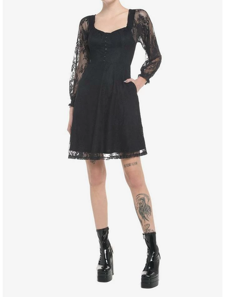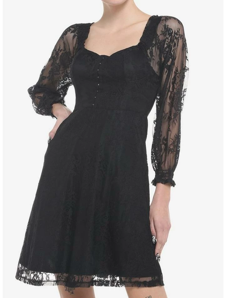 Keep your LBD collection romantic and dreamy with this long-sleeve dress! Featuring a corset-styled bust with hook-and-eye closures down the center and bust cup seams, plus an elasticated sweetheart neckline with lace long-sleeves. Comes with a layer of black rosy lace on the skirt and complete with hip pockets, plus a smock panel on the back for some stretch.