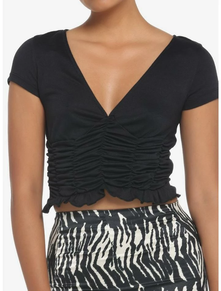 Looking for the cutest top ever to just throw on and head out the door? This is it. It’s a cropped V-neck top with cinched waist detail and super flattering ruching on the front to give it a little extra flair.