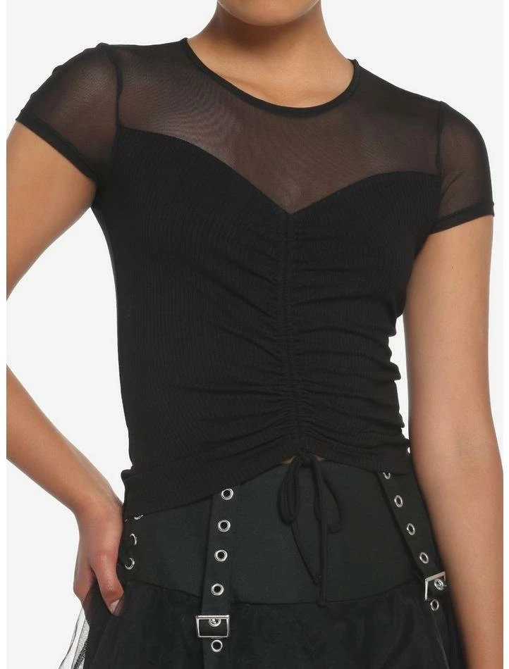 Add more all-black looks to your rotation with this supercute black, ribbed top! Featuring a mesh panel at the chest and shoulders and ruching down the front with drawstring detailing.