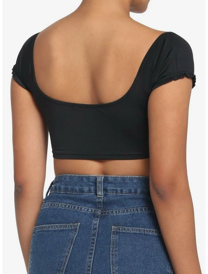 Spice up your summer look with a flirty top! This black one has a fitted, cropped silhouette and an elasticated neckline. Comes with puff sleeves and ruching on the front with adjustable drawstring detailing.