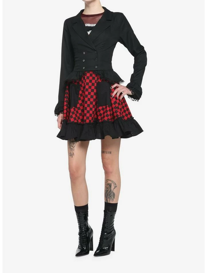 Give your wardrobe a touch of gothic romance! Elevate any look with this black, double-breasted jacket! It has a cropped fit and features a ruffled peplum hem with delicate lace trimming. Comes with more ruffles at the cuffs and lace-up detailing on the back.