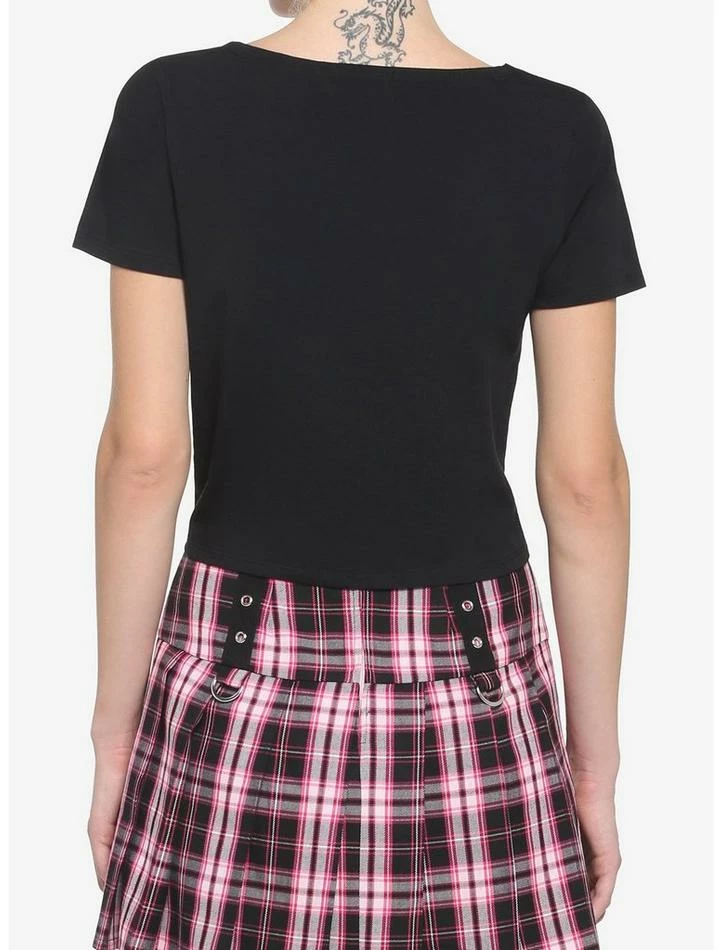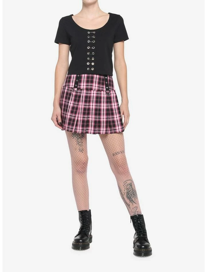 Refresh your wardrobe with more emo pieces! This black, cropped tee is sure to be your next fave! It has a scoop neckline and features grommet and removable safety pin detailing down the front.