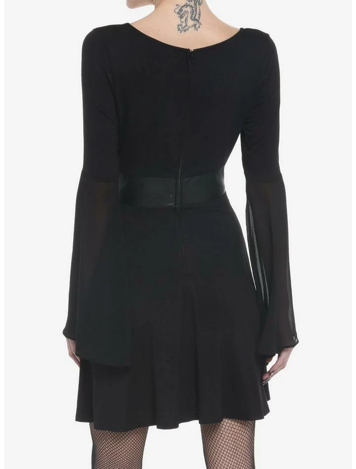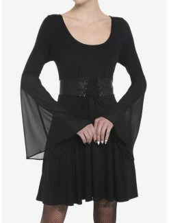 Need a bewitching new LBD to add to your wardrobe? Add some gothic vibes to your closet with this long-sleeve dress! Featuring satin bell sleeves and faux leather corset lace-up detailing at the waist. Comes with pockets and back zipper closure.