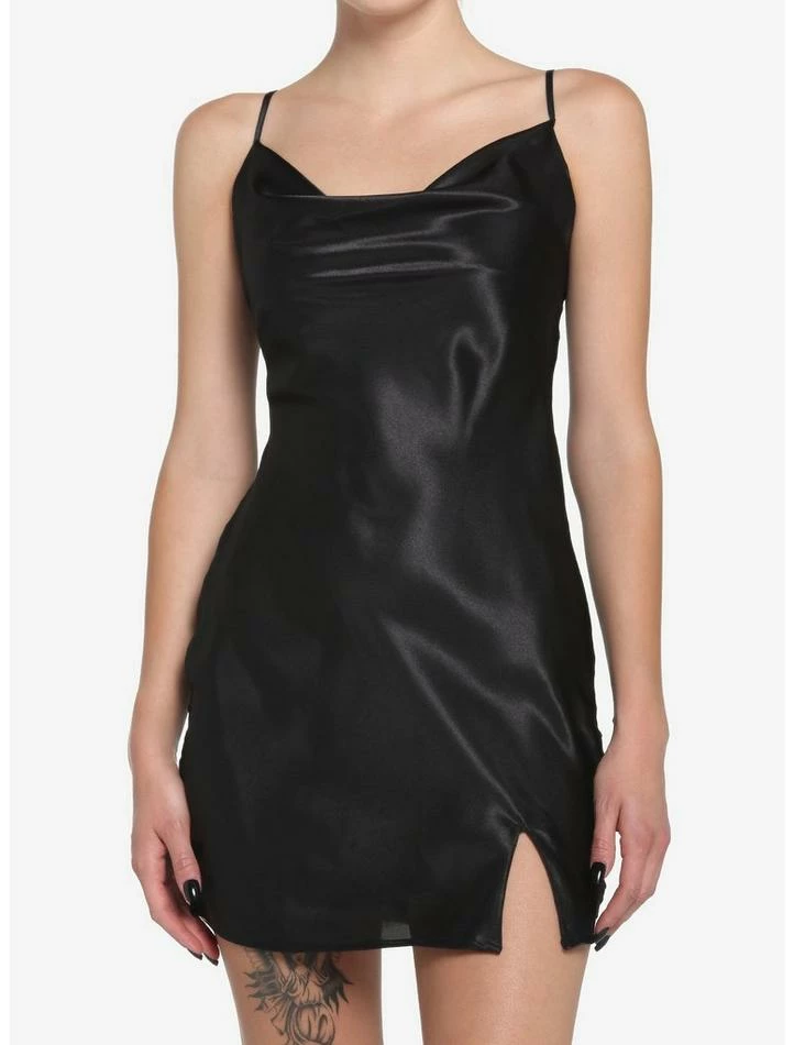 Lookin’ for the perfect lil’ black dress? We gotchu! This black, satin slip dress is exactly what you need for a flirty night out! It has a bodycon fit with adjustable straps, cowl neckline and side slit.