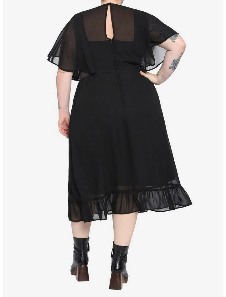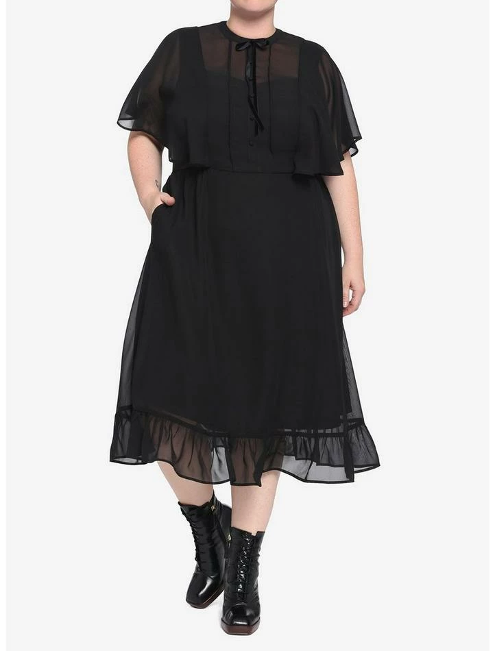 You deserve to sport your witchy side without overheating. Thankfully, this capelet midi dress features airy, sheer layers that let in the breeze! Details include button and zipper closure, short cape sleeves, faux velvet tie at the neck and pockets.