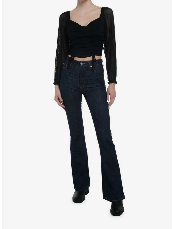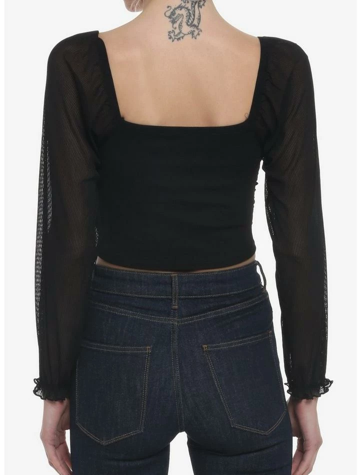 Give your soft girl look some edge with this black peasant top! It has a cropped fit and comes with built-in bra cups and double ruched detailing on the front. The sheer long-sleeves have ruffle trimming with elastic at the shoulder. Pair it with jeans or a mini skirt to complete your look!
