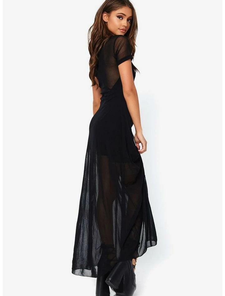 Need a quick witchy look? This long, black sheer dress features short sleeves and a high slit in the front. Black spandex romper sold separately.
