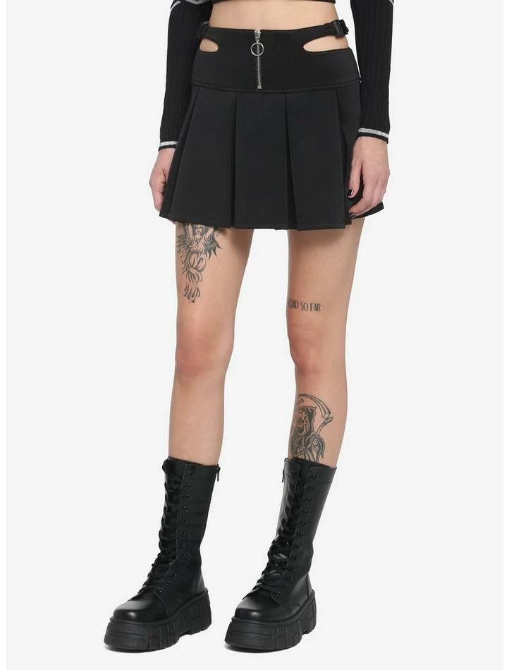 Spice up your classic black skirt with some saucy details! This pleated skirt features an elasticated, buckle waistband that creates side cutout detailing. Comes with a front zipper closure with an O-ring zipper pull.