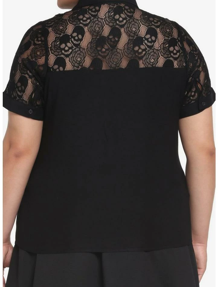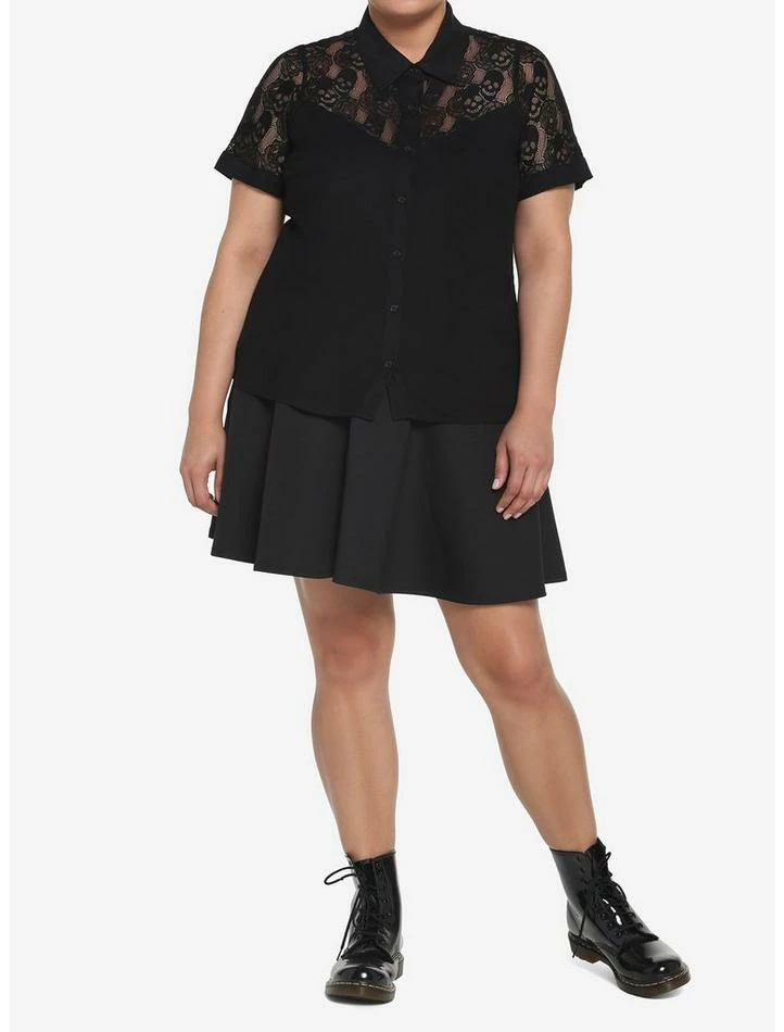 We’ve got the perfect top to complete your preppy-goth look! This black woven button-up features a lace panel along the shoulders and sleeves, with a skull and rose pattern. Complete with a soft collar.
