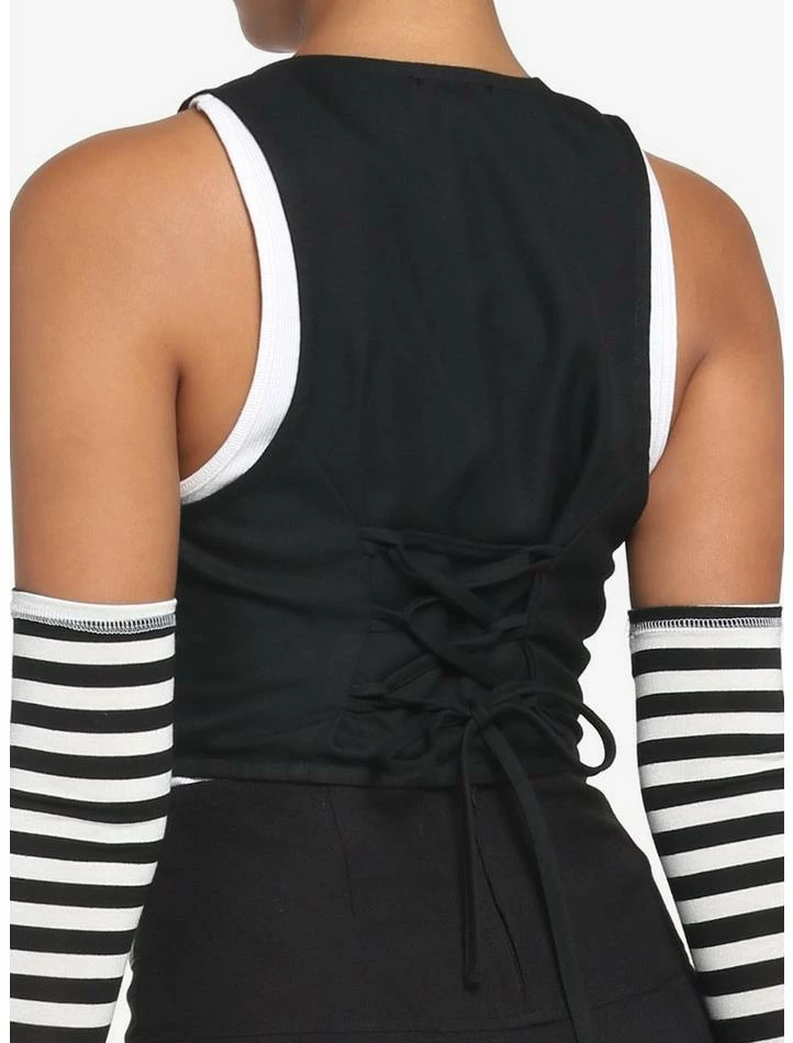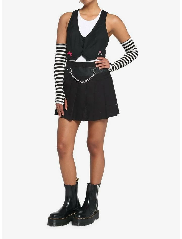 Hey, hey! You, you! Lookin’ to change up your look? Channel those early 2000s pop punk vibes in this black, cropped vest! Featuring pink bow and skull accents on the front, with lace-up detailing on the back to give you a more fitted silhouette.