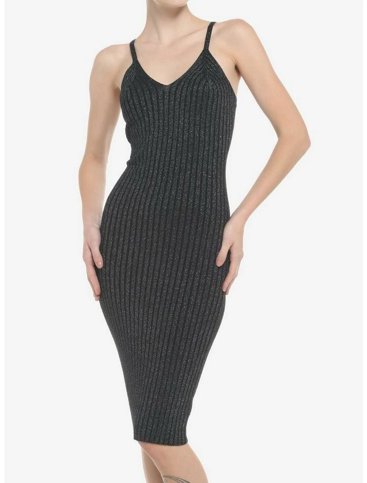 Love a sparkly moment? This midi-length bodycon dress will mix up your dress selection with its black sparkle knit.