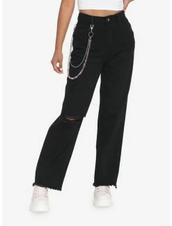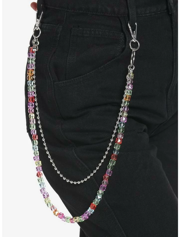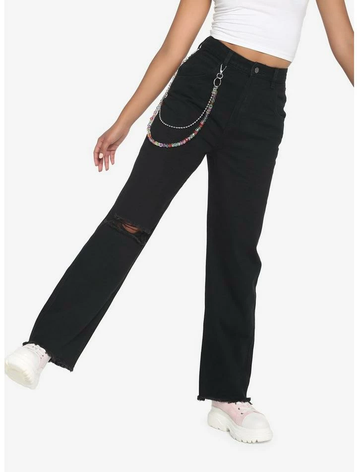 Add some colorful flair to your black jeans collection with this pair! They’re straight leg with raw cuffs, distressing in one knee, and a removable chain featuring multicolored beads.