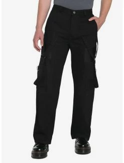 It’s all about the details. Elevate your classic black pant look with this pair! Featuring a wide leg fit with strap detailing down the leg. Comes with mesh patchwork cargo pockets with silver-tone D-ring accents. Complete with hip and back pockets.