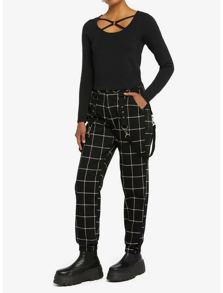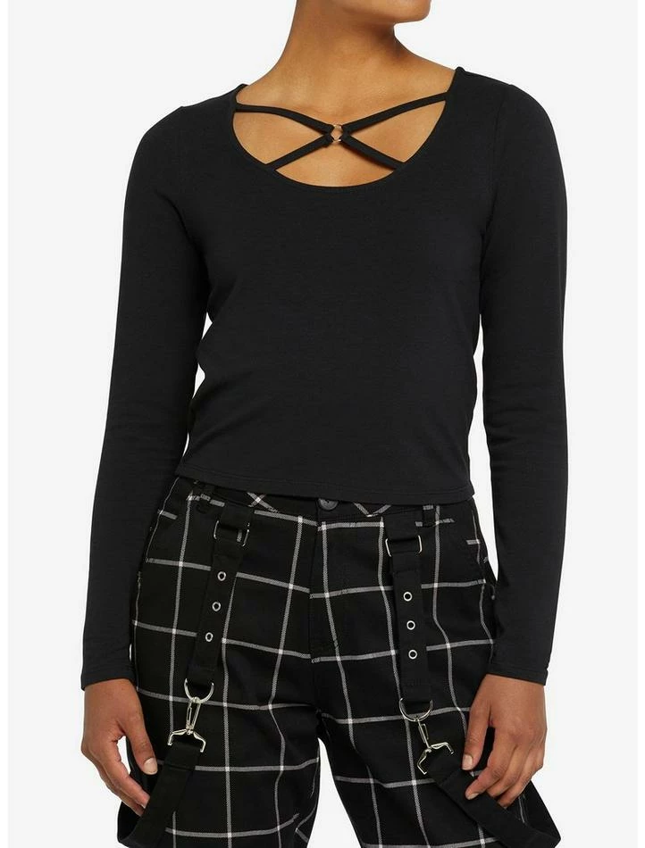 It’s all in the details. This black long-sleeve top features crisscross straps on the front with a silver-tone O-ring in the center and cropped length.