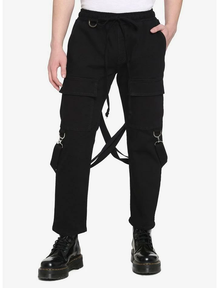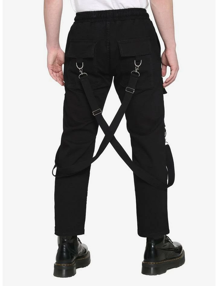 Mix it up with these wide legged cargo pants. They feature black detachable suspenders and side, back and front leg pockets, and an elastic drawstring waist. Comfy, functional and stylish.