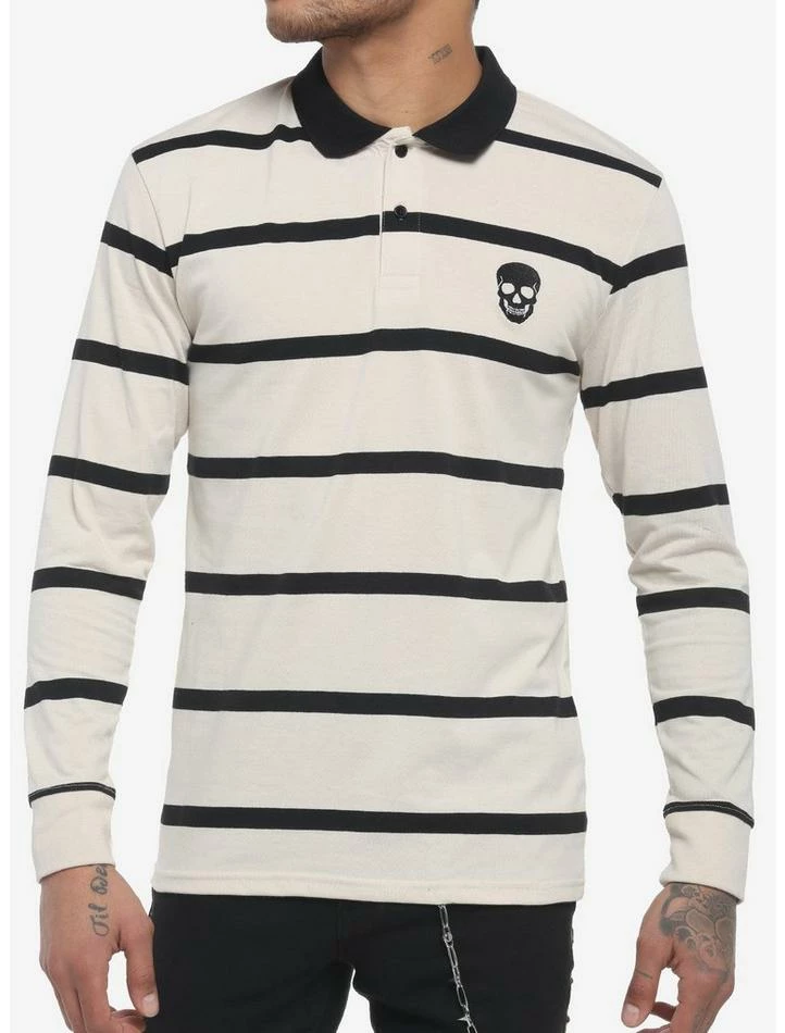 Preppy with a twist? Of course it’s from Hot Topic. This long-sleeved polo shirt is tan with black stripes and a black collar, plus an embroidered skull on the chest.
