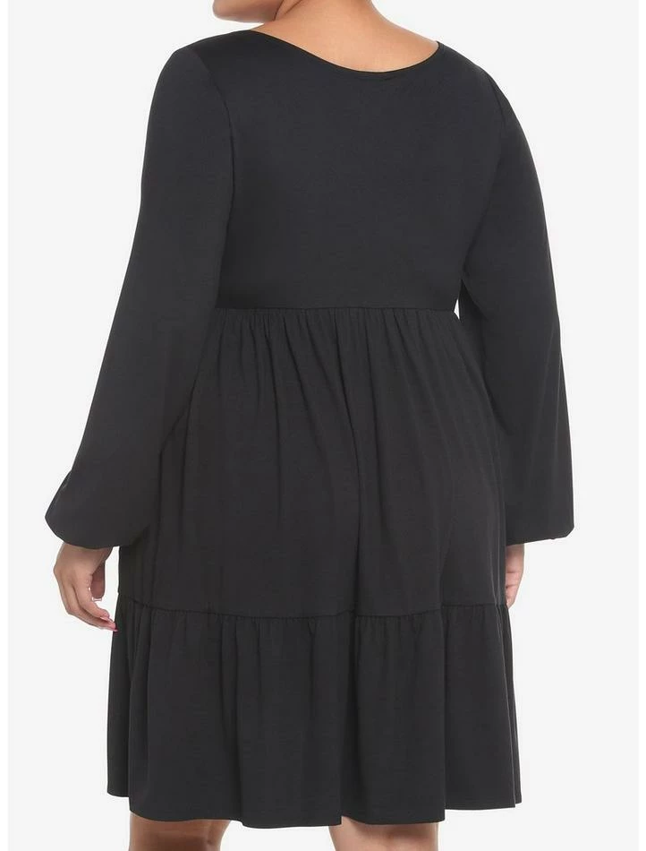 You can never have too many black dresses in your closet! Get ready for fall with this piece! This black, long-sleeved dress features a tiered skirt and an elasticated waistband for comfort. Plus, it comes with pockets!