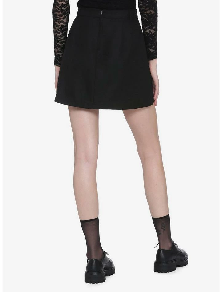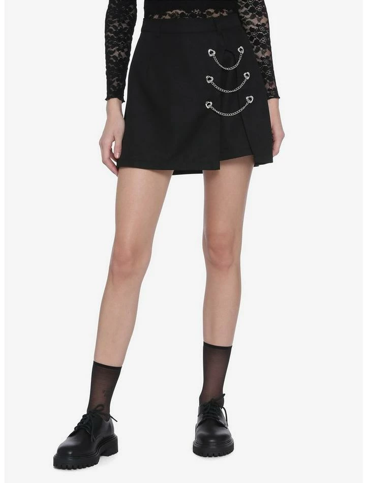 What’s better than two cute chain on your skirt? Three cute chains! This black mini features a faux split in the front with chains across the gap with heart fasteners. Featuring a side zipper and belt loops.