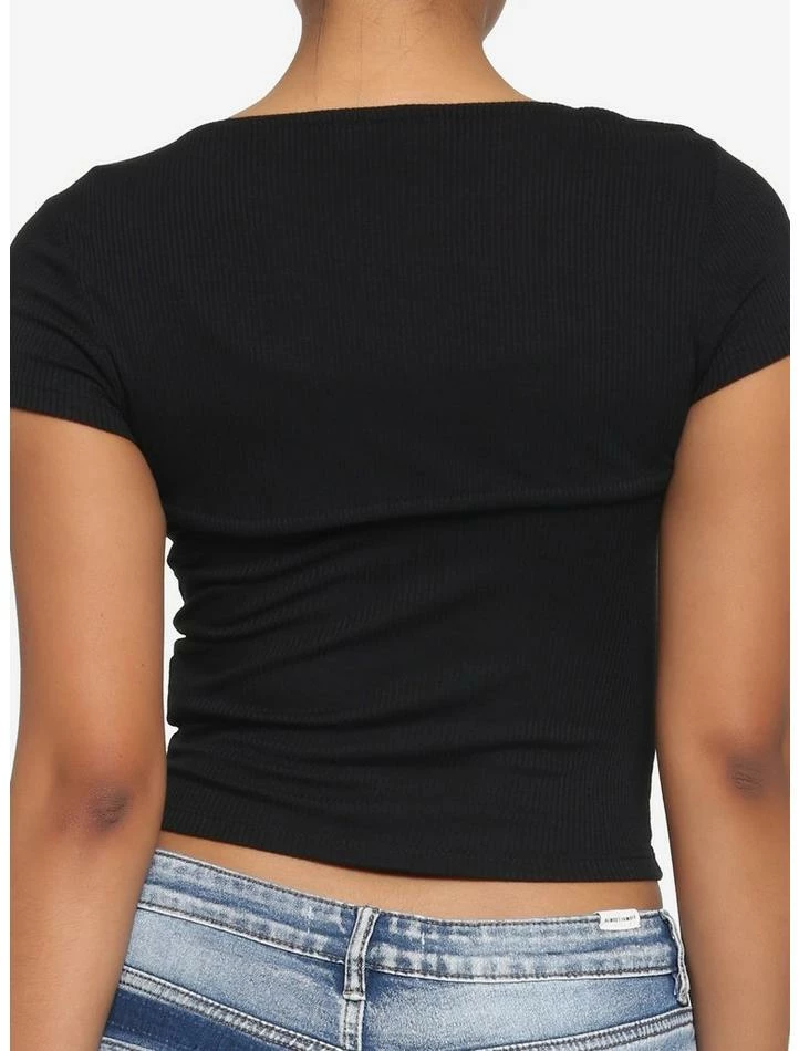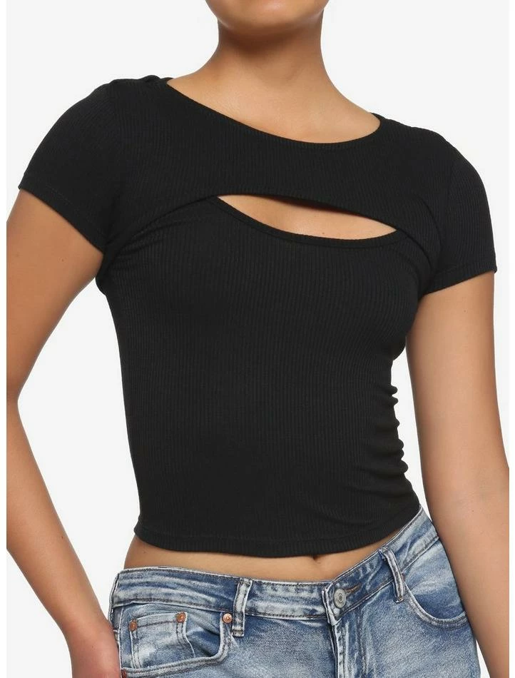 Your summer wardrobe needs a staple black top! This fitted twofer features a cami below and cap sleeves on top, creating cutout detailing at the chest. Perfect for dressing up or down!