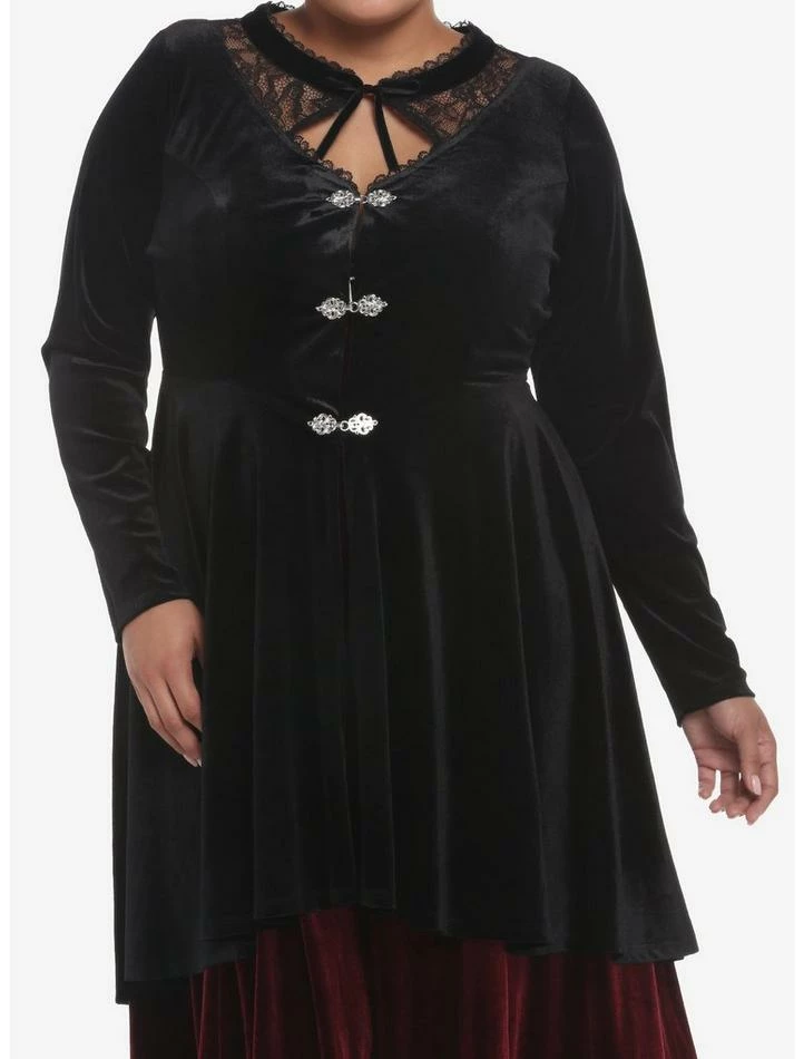 Β An outfit topper that’s as dramatic as what’s underneath? You’ve found it. This hi-low jacket made of black velvet has a lace neckline with satin bowtie, and ornate, silver-tone clasps going down the front.