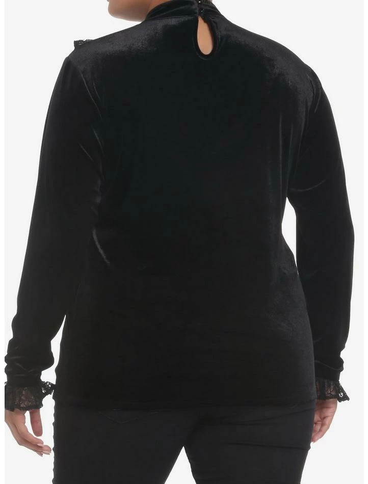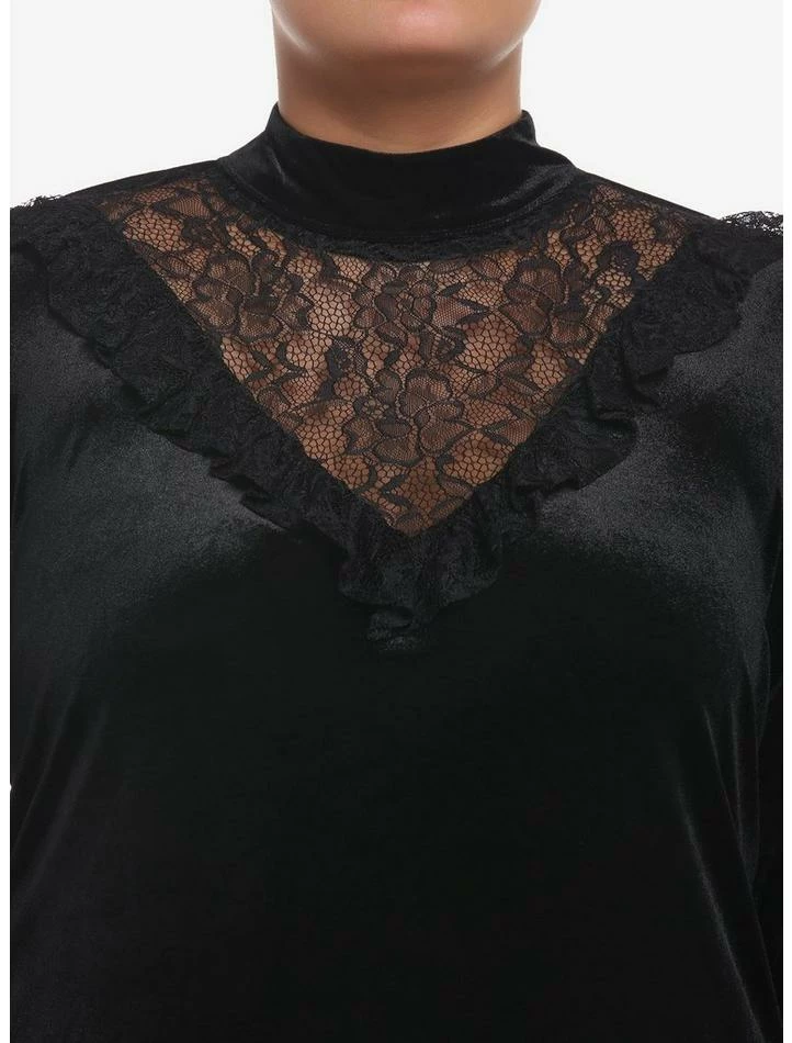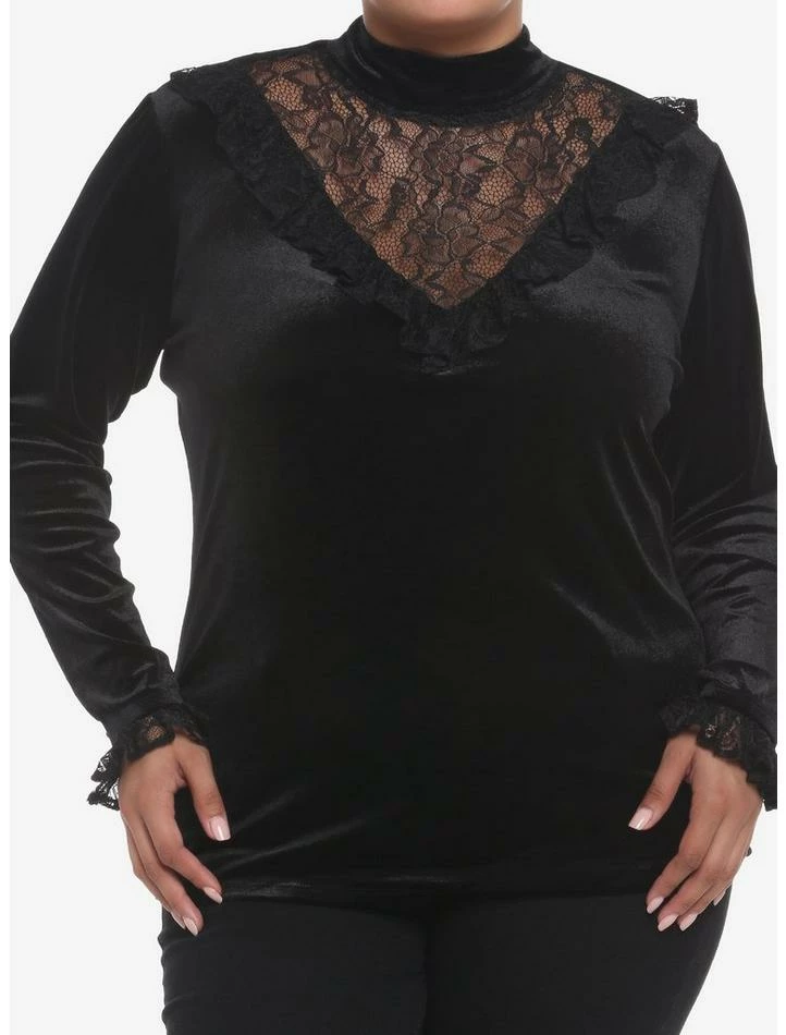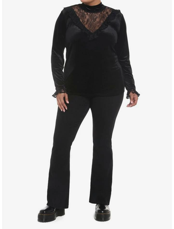 You have the perfect skirt and pants for a moody look, now you need the perfect top. Set the mood in this black velvet turtleneck with lots of lace detail on the sleeves and across the shoulders and neck for added drama.