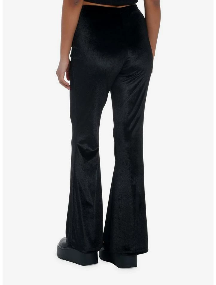 Move over, straight legs! Flares are comin’ for ya. Try these comfy flare pants in black velvet; they have lace-up detail on the hips.