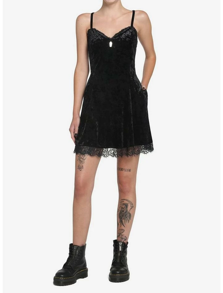 This black velvet dress is destined to be your new go-to piece. It features lace trim, velvet bow, pockets and adjustable straps.ย