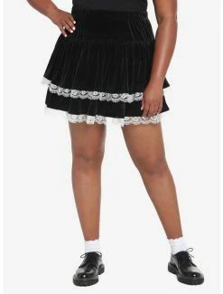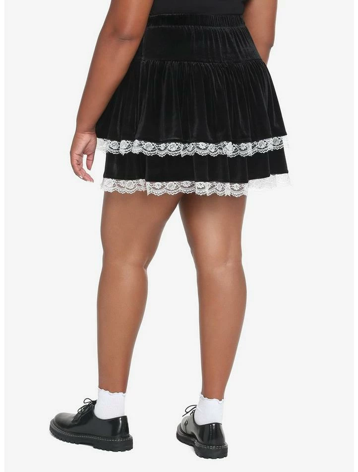 Get ready to twirl in this black velvet skirt featuring tiers with white lace trim and an elastic waistband.