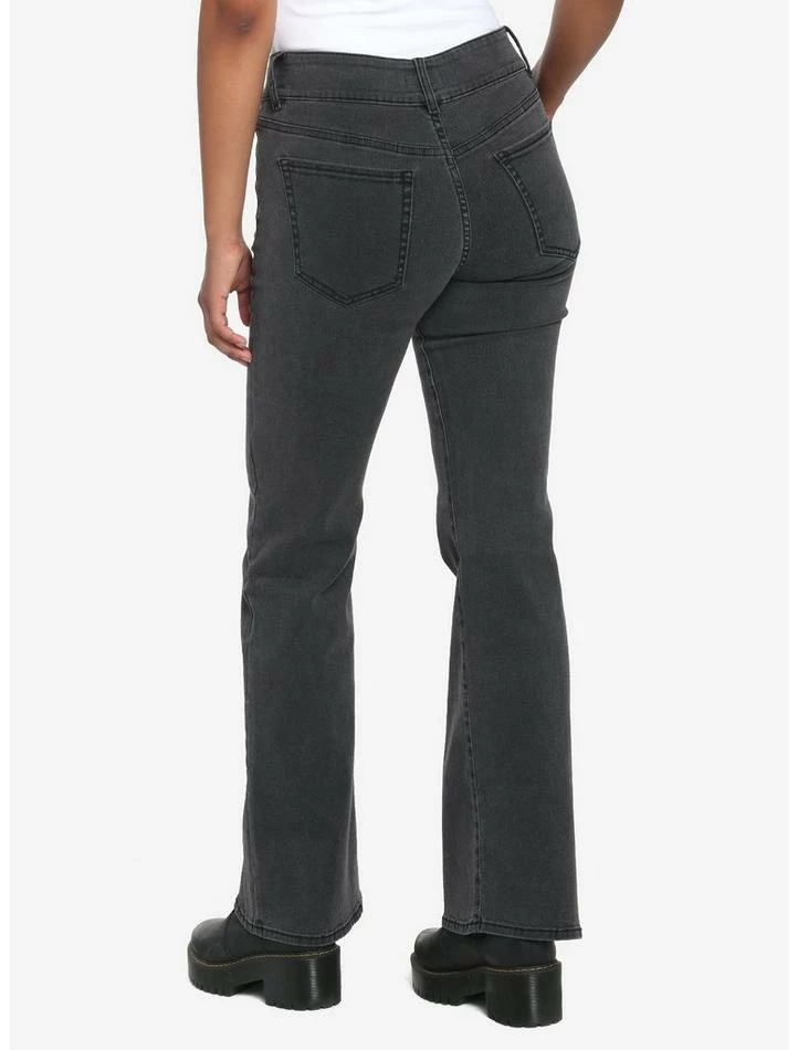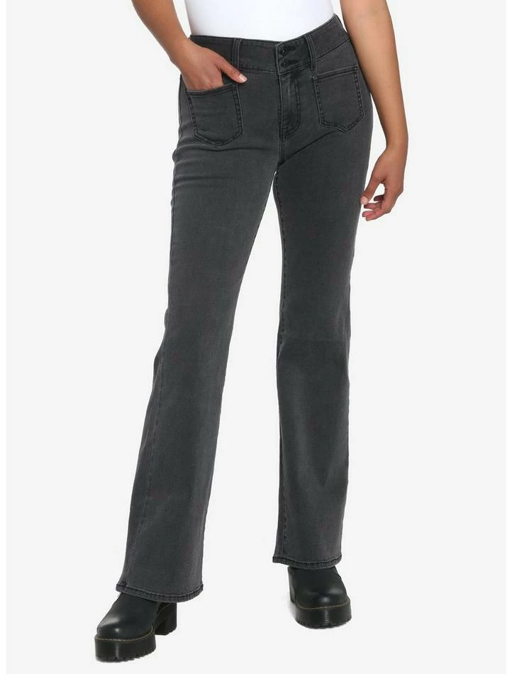 Add some vintage vibes to your look with these black, denim jeans! They have a flare fit and feature front and back pockets. Complete with a double button and zipper closure.