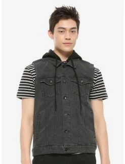 Keep your denim stylin’ all year long with a denim vest! This black washed version is ideal for showing off all your patches and pins. Featuring 4 pockets, button front closure and a removable, drawstring hood.