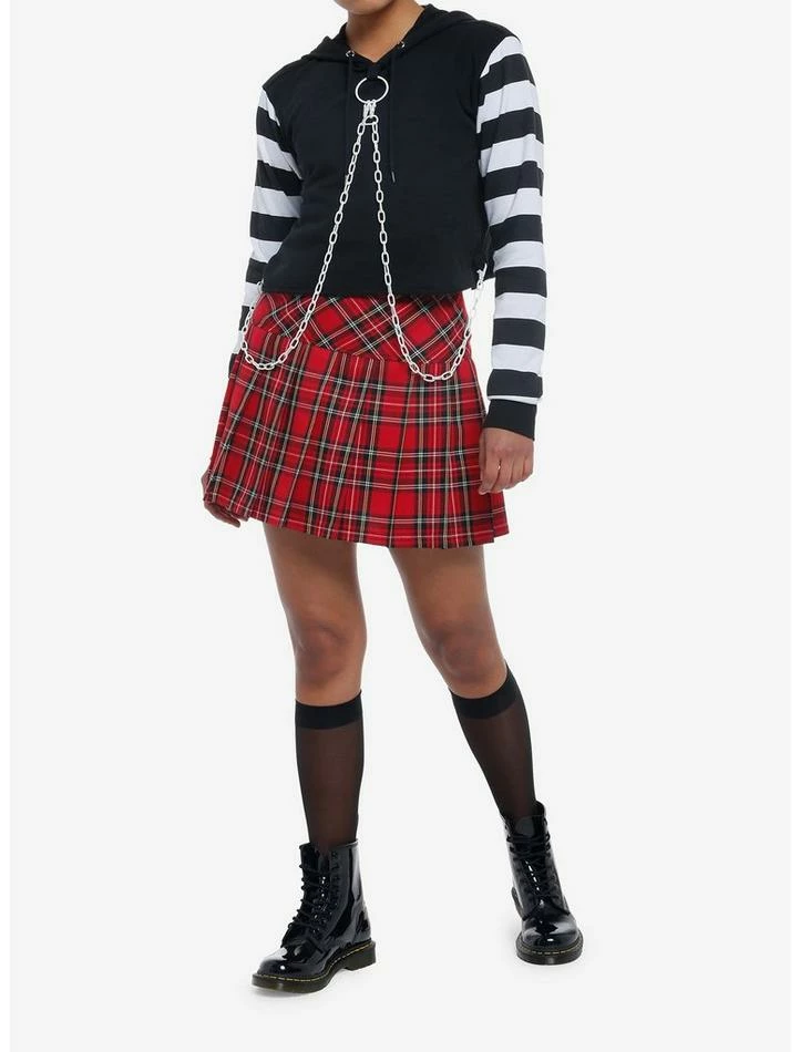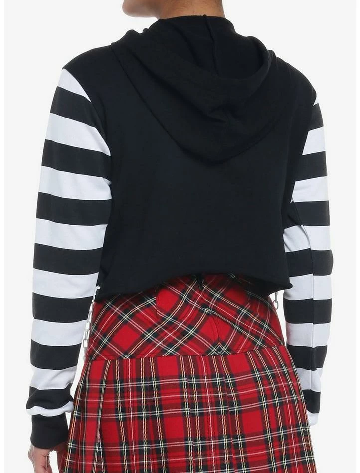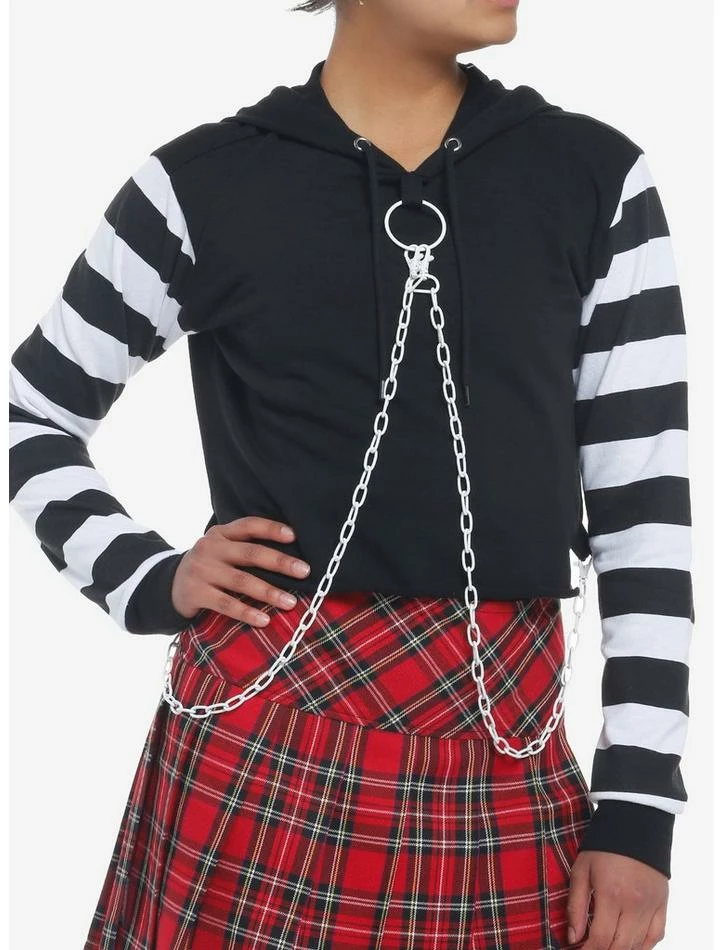 Chained to the same old hoodies in your closet? Break free with this fresh style. The cropped hoodie has striped sleeves and a large white chain draped across the front and connected by an O-ring. Drawstring hood.