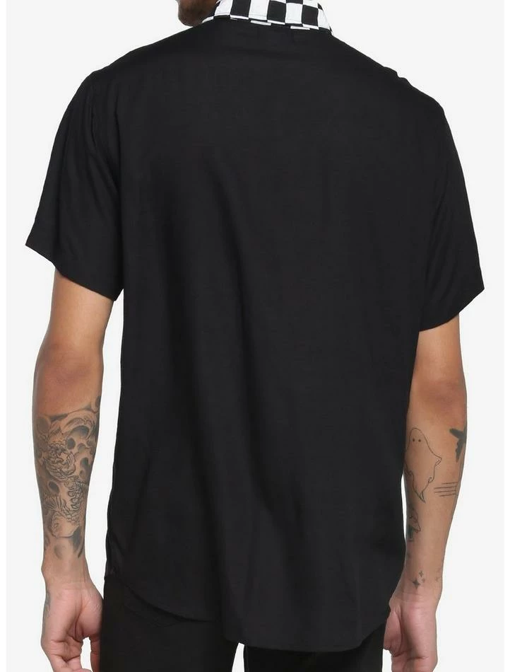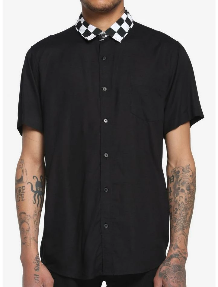 Keep it classy, but make it punk. Add some dimension to your look with this black, woven button-up! It features a black and white checkered collar and comes with a front chest pocket.