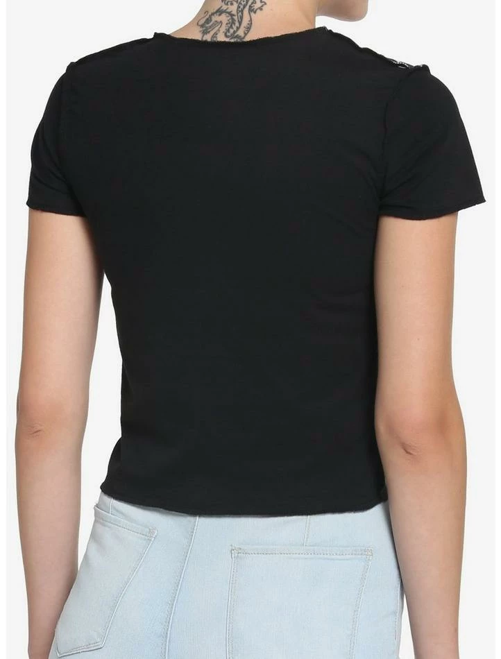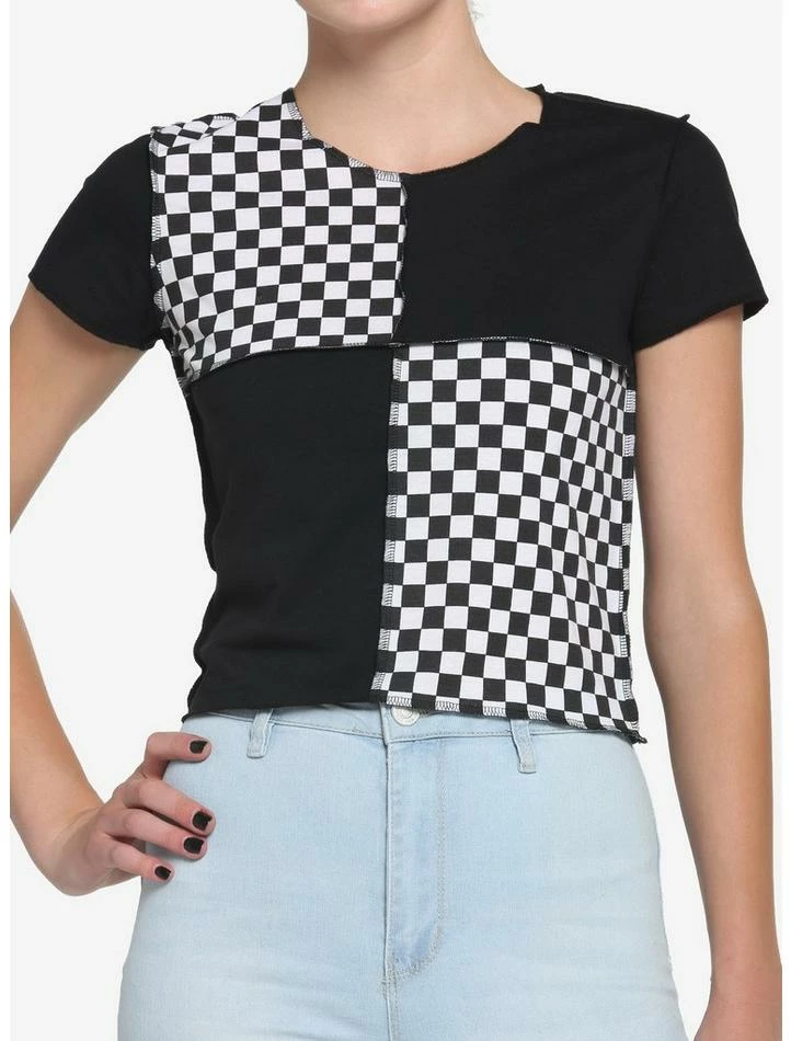 Check. You. Out. This black tee features a solid black and black and white checkered color-block design and baby fit.