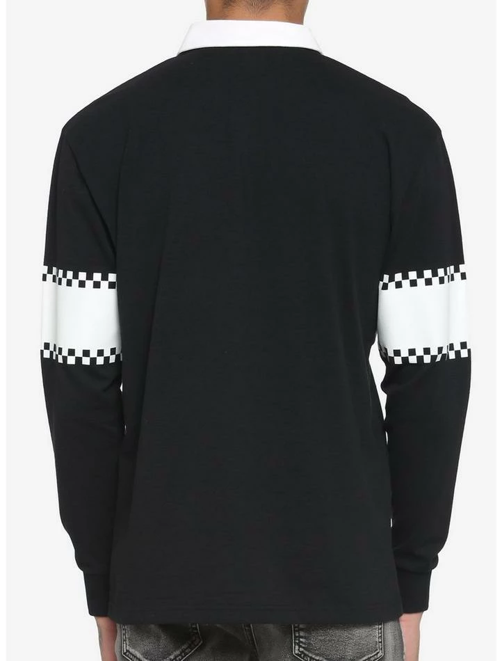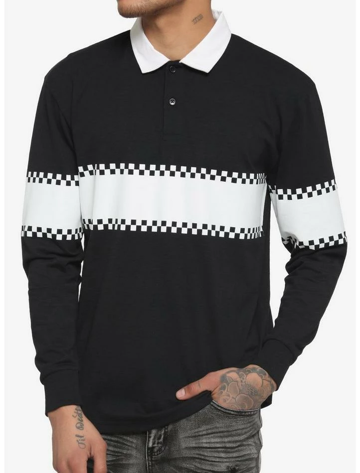 Keep your ‘fit in check with this long-sleeved polo! Featuring white stripe detailing across the chest and arms, with a black and white checkered border. Complete with buttons at the neck and white contrast collar.