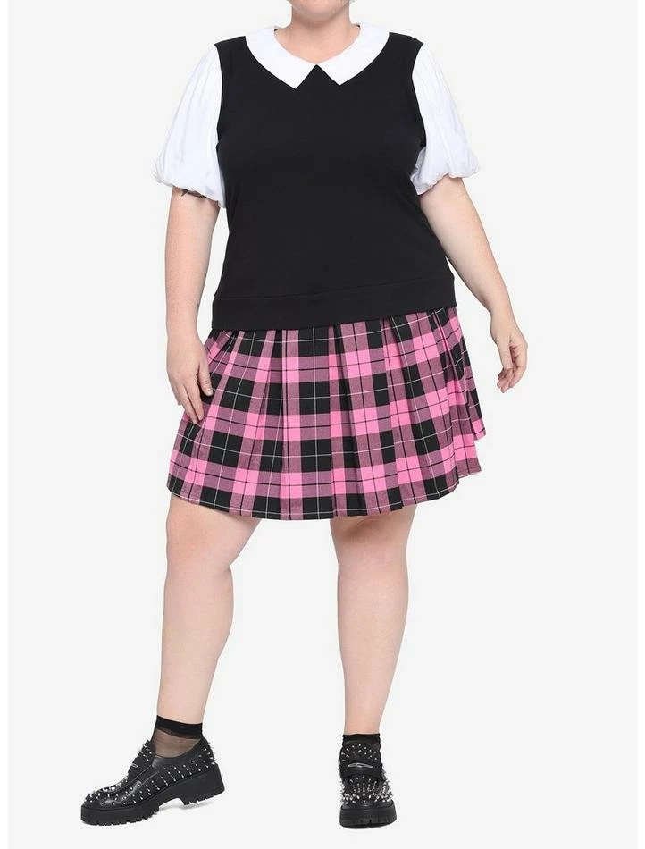 Get that layered look effortlessly with this twofer top featuring a black vest-like body with white puffed sleeves and collar.
