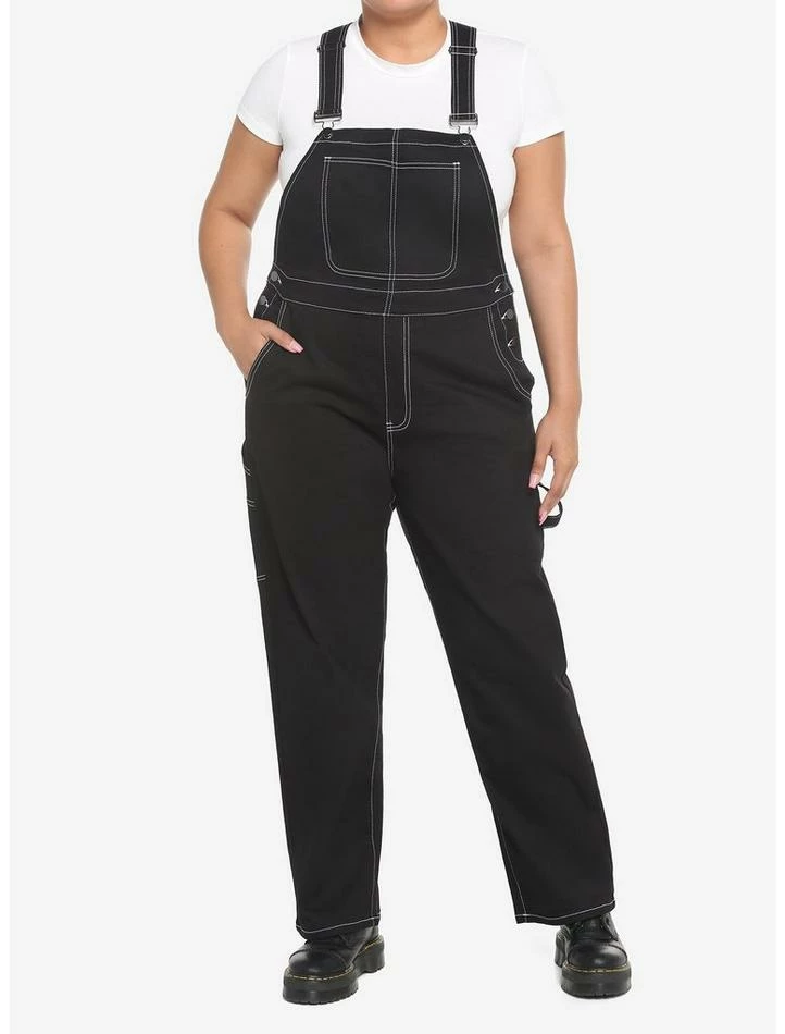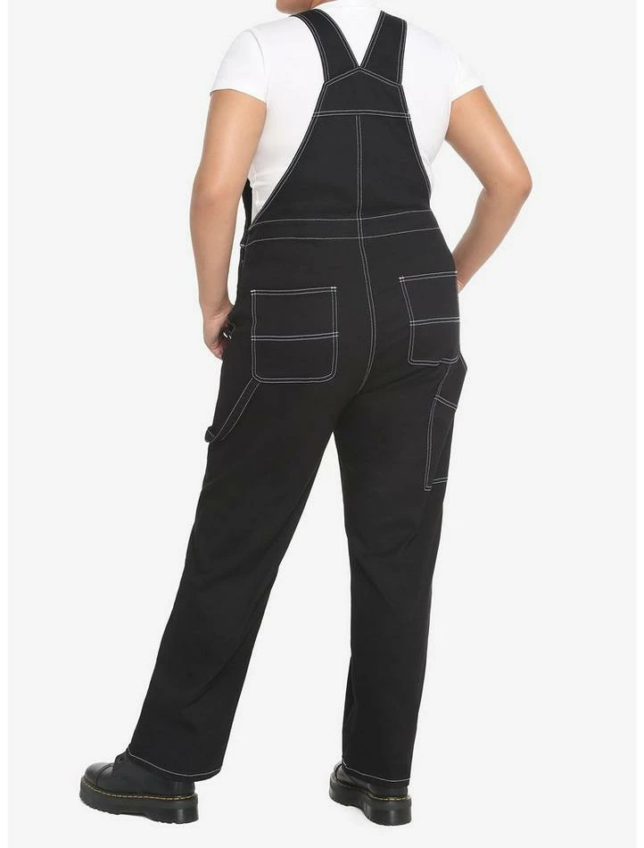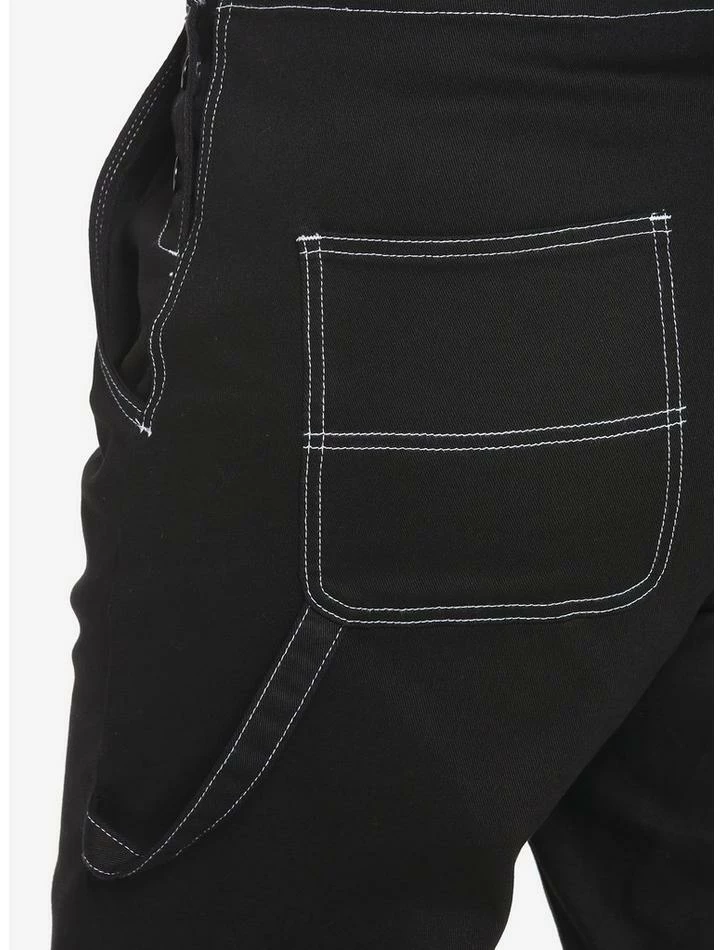 Overalls are back in style! Get a cute and comfy look in these black overalls. Featuring white contrast stitching, plus chest, hip and back pockets. Comes with adjustable straps and triple button side closures.