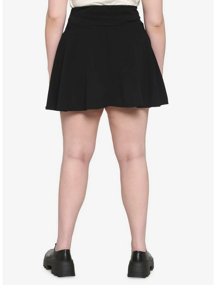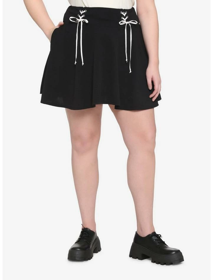 More skirts? You got it. This black skater skirt features double white lace-up detail on the waistband and pockets.