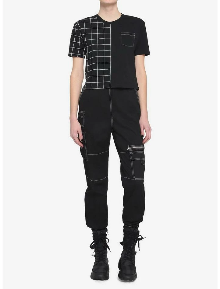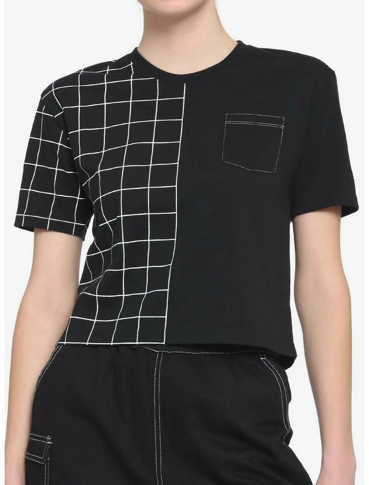 Who wears single print tees anymore? This cropped shirt features a split design with a black and white grid print on the right and solid black on the left. There is also a chest pocket with white contrast stitching.