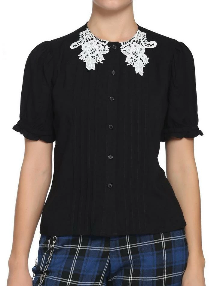 Refine your style! This woven button-up shirt features lace detailing on the collar, pleats down the front and puffed sleeves.